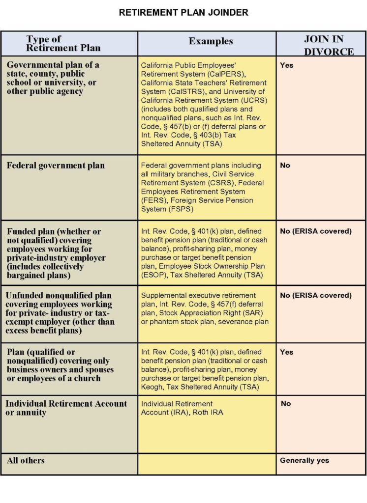 To determine if your plan is required to be divided by QDRO, California provides a recommend a list of retirement accounts which should be added to the divorce and accounts which do not need to be. In other words, the retirement plan will need to be “joined” to the divorce proceeding. The plan becomes a party to the divorce proceeding and will have to file a response. Joining the plan is not usually adversarial in nature. It is an administrative requirement.